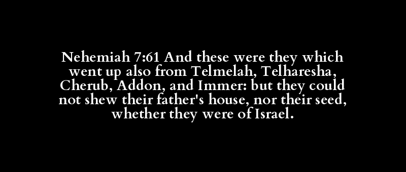 Nehemiah 7:61 And these were they which went up also from Telmelah, Telharesha, Cherub, Addon, and Immer: but they could not shew their father's house, nor their seed, whether they were of Israel.