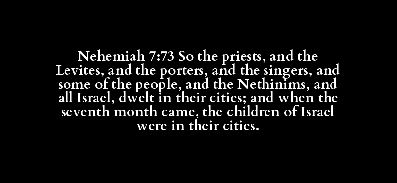 Nehemiah 7:73 So the priests, and the Levites, and the porters, and the singers, and some of the people, and the Nethinims, and all Israel, dwelt in their cities; and when the seventh month came, the children of Israel were in their cities.