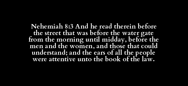 Nehemiah 8:3 And he read therein before the street that was before the water gate from the morning until midday, before the men and the women, and those that could understand; and the ears of all the people were attentive unto the book of the law.