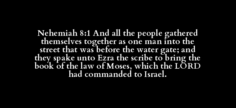 Nehemiah 8:1 And all the people gathered themselves together as one man into the street that was before the water gate; and they spake unto Ezra the scribe to bring the book of the law of Moses, which the LORD had commanded to Israel.