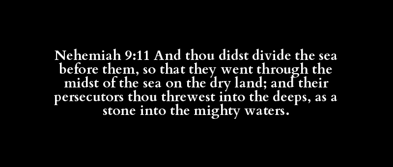 Nehemiah 9:11 And thou didst divide the sea before them, so that they went through the midst of the sea on the dry land; and their persecutors thou threwest into the deeps, as a stone into the mighty waters.