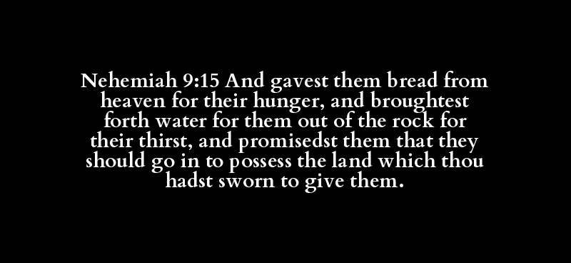 Nehemiah 9:15 And gavest them bread from heaven for their hunger, and broughtest forth water for them out of the rock for their thirst, and promisedst them that they should go in to possess the land which thou hadst sworn to give them.
