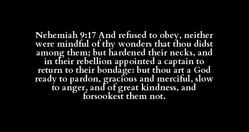 Nehemiah 9:17 And refused to obey, neither were mindful of thy wonders that thou didst among them; but hardened their necks, and in their rebellion appointed a captain to return to their bondage: but thou art a God ready to pardon, gracious and merciful, slow to anger, and of great kindness, and forsookest them not.