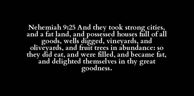 Nehemiah 9:25 And they took strong cities, and a fat land, and possessed houses full of all goods, wells digged, vineyards, and oliveyards, and fruit trees in abundance: so they did eat, and were filled, and became fat, and delighted themselves in thy great goodness.