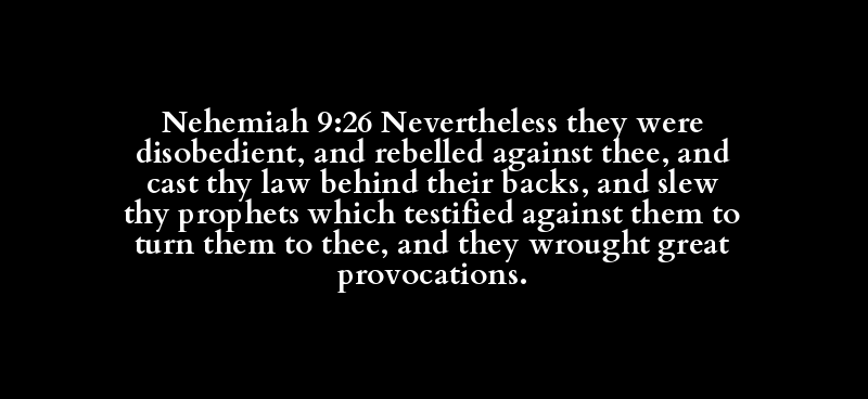 Nehemiah 9:26 Nevertheless they were disobedient, and rebelled against thee, and cast thy law behind their backs, and slew thy prophets which testified against them to turn them to thee, and they wrought great provocations.