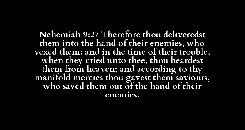 Nehemiah 9:27 Therefore thou deliveredst them into the hand of their enemies, who vexed them: and in the time of their trouble, when they cried unto thee, thou heardest them from heaven; and according to thy manifold mercies thou gavest them saviours, who saved them out of the hand of their enemies.