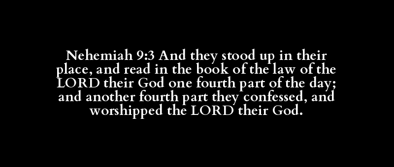 Nehemiah 9:3 And they stood up in their place, and read in the book of the law of the LORD their God one fourth part of the day; and another fourth part they confessed, and worshipped the LORD their God.