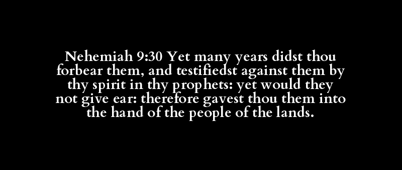 Nehemiah 9:30 Yet many years didst thou forbear them, and testifiedst against them by thy spirit in thy prophets: yet would they not give ear: therefore gavest thou them into the hand of the people of the lands.
