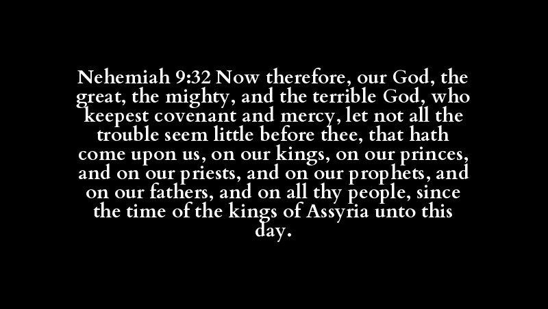 Nehemiah 9:32 Now therefore, our God, the great, the mighty, and the terrible God, who keepest covenant and mercy, let not all the trouble seem little before thee, that hath come upon us, on our kings, on our princes, and on our priests, and on our prophets, and on our fathers, and on all thy people, since the time of the kings of Assyria unto this day.