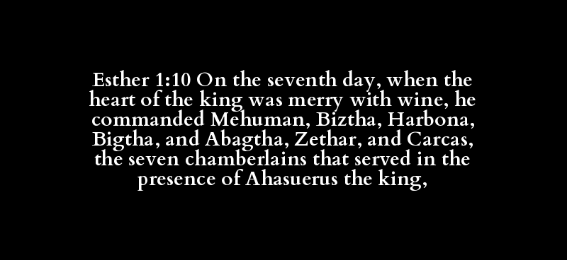 Esther 1:10 On the seventh day, when the heart of the king was merry with wine, he commanded Mehuman, Biztha, Harbona, Bigtha, and Abagtha, Zethar, and Carcas, the seven chamberlains that served in the presence of Ahasuerus the king,