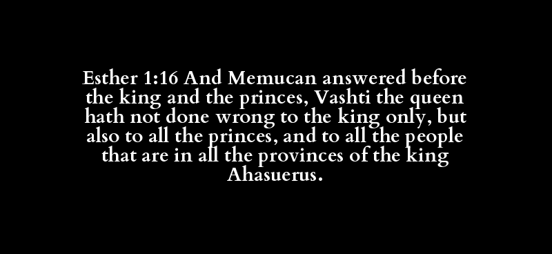 Esther 1:16 And Memucan answered before the king and the princes, Vashti the queen hath not done wrong to the king only, but also to all the princes, and to all the people that are in all the provinces of the king Ahasuerus.