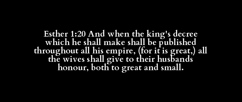 Esther 1:20 And when the king's decree which he shall make shall be published throughout all his empire, (for it is great,) all the wives shall give to their husbands honour, both to great and small.