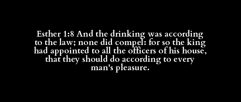 Esther 1:8 And the drinking was according to the law; none did compel: for so the king had appointed to all the officers of his house, that they should do according to every man's pleasure.