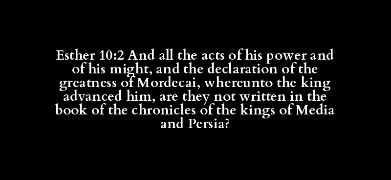 Esther 10:2 And all the acts of his power and of his might, and the declaration of the greatness of Mordecai, whereunto the king advanced him, are they not written in the book of the chronicles of the kings of Media and Persia?