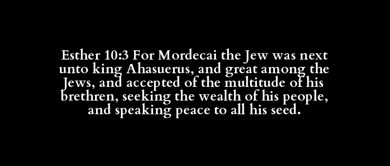 Esther 10:3 For Mordecai the Jew was next unto king Ahasuerus, and great among the Jews, and accepted of the multitude of his brethren, seeking the wealth of his people, and speaking peace to all his seed.