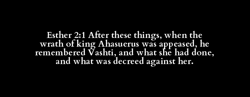 Esther 2:1 After these things, when the wrath of king Ahasuerus was appeased, he remembered Vashti, and what she had done, and what was decreed against her.