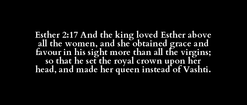 Esther 2:17 And the king loved Esther above all the women, and she obtained grace and favour in his sight more than all the virgins; so that he set the royal crown upon her head, and made her queen instead of Vashti.