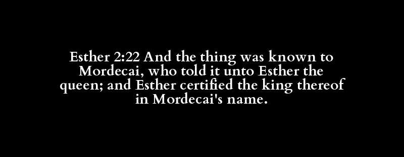 Esther 2:22 And the thing was known to Mordecai, who told it unto Esther the queen; and Esther certified the king thereof in Mordecai's name.