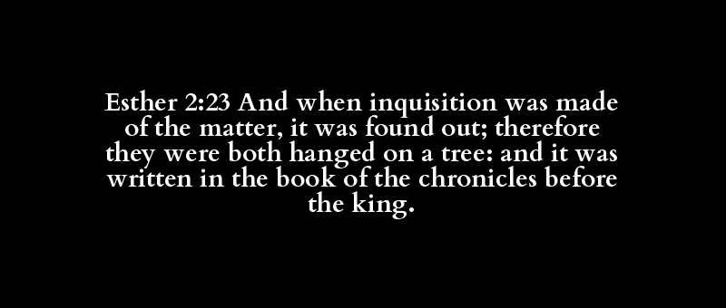 Esther 2:23 And when inquisition was made of the matter, it was found out; therefore they were both hanged on a tree: and it was written in the book of the chronicles before the king.