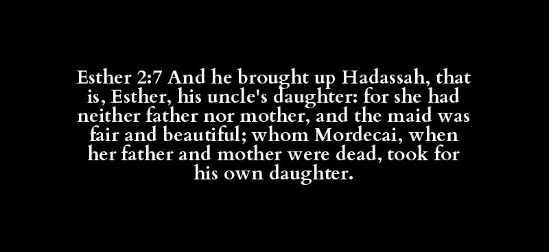 Esther 2:7 And he brought up Hadassah, that is, Esther, his uncle's daughter: for she had neither father nor mother, and the maid was fair and beautiful; whom Mordecai, when her father and mother were dead, took for his own daughter.