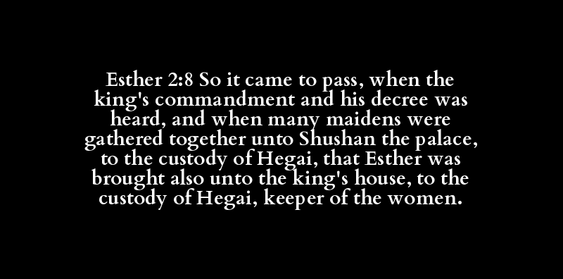 Esther 2:8 So it came to pass, when the king's commandment and his decree was heard, and when many maidens were gathered together unto Shushan the palace, to the custody of Hegai, that Esther was brought also unto the king's house, to the custody of Hegai, keeper of the women.