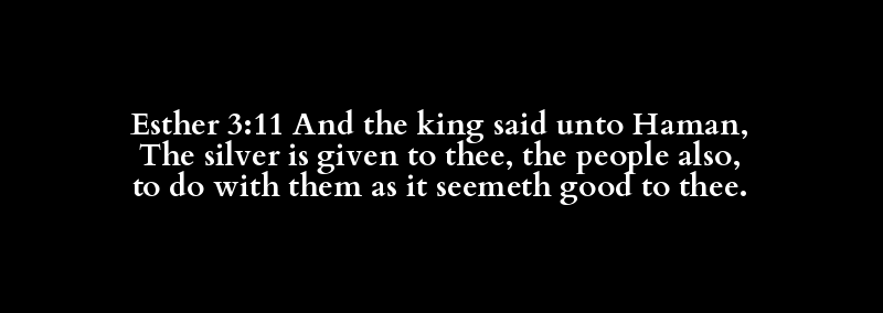 Esther 3:11 And the king said unto Haman, The silver is given to thee, the people also, to do with them as it seemeth good to thee.
