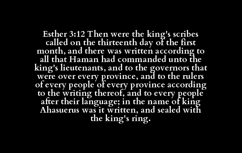 Esther 3:12 Then were the king's scribes called on the thirteenth day of the first month, and there was written according to all that Haman had commanded unto the king's lieutenants, and to the governors that were over every province, and to the rulers of every people of every province according to the writing thereof, and to every people after their language; in the name of king Ahasuerus was it written, and sealed with the king's ring.