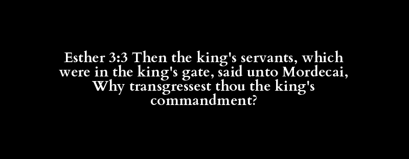 Esther 3:3 Then the king's servants, which were in the king's gate, said unto Mordecai, Why transgressest thou the king's commandment?