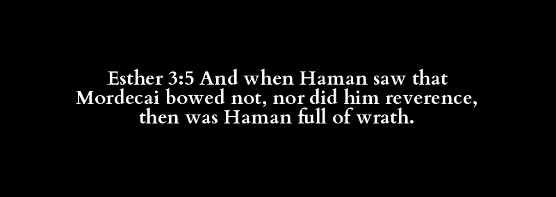 Esther 3:5 And when Haman saw that Mordecai bowed not, nor did him reverence, then was Haman full of wrath.