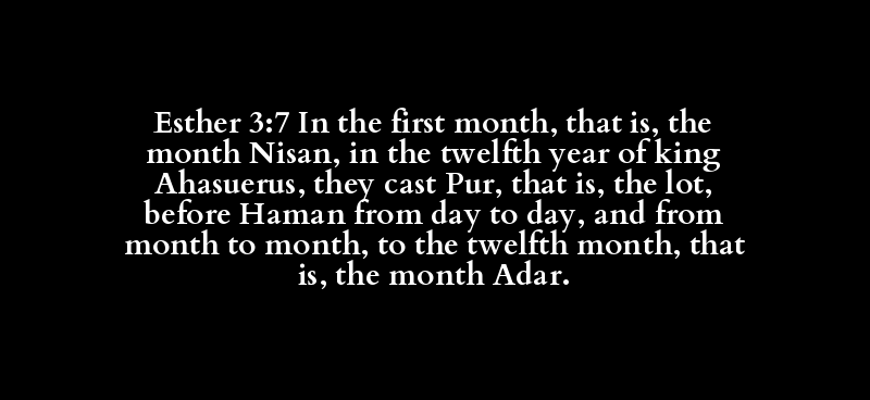 Esther 3:7 In the first month, that is, the month Nisan, in the twelfth year of king Ahasuerus, they cast Pur, that is, the lot, before Haman from day to day, and from month to month, to the twelfth month, that is, the month Adar.
