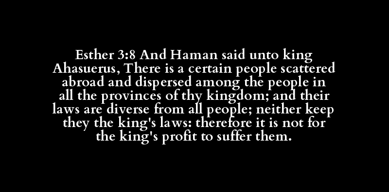 Esther 3:8 And Haman said unto king Ahasuerus, There is a certain people scattered abroad and dispersed among the people in all the provinces of thy kingdom; and their laws are diverse from all people; neither keep they the king's laws: therefore it is not for the king's profit to suffer them.