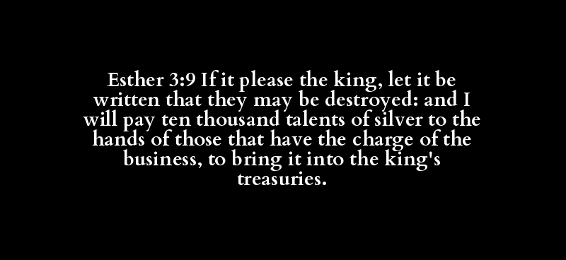 Esther 3:9 If it please the king, let it be written that they may be destroyed: and I will pay ten thousand talents of silver to the hands of those that have the charge of the business, to bring it into the king's treasuries.