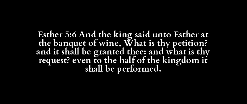 Esther 5:6 And the king said unto Esther at the banquet of wine, What is thy petition? and it shall be granted thee: and what is thy request? even to the half of the kingdom it shall be performed.