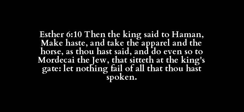 Esther 6:10 Then the king said to Haman, Make haste, and take the apparel and the horse, as thou hast said, and do even so to Mordecai the Jew, that sitteth at the king's gate: let nothing fail of all that thou hast spoken.