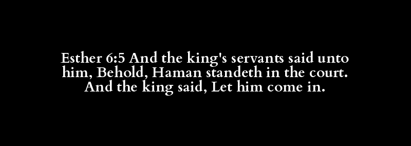Esther 6:5 And the king's servants said unto him, Behold, Haman standeth in the court. And the king said, Let him come in.