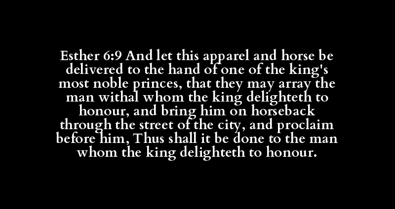 Esther 6:9 And let this apparel and horse be delivered to the hand of one of the king's most noble princes, that they may array the man withal whom the king delighteth to honour, and bring him on horseback through the street of the city, and proclaim before him, Thus shall it be done to the man whom the king delighteth to honour.