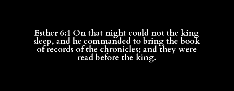 Esther 6:1 On that night could not the king sleep, and he commanded to bring the book of records of the chronicles; and they were read before the king.