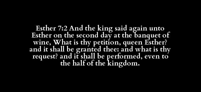 Esther 7:2 And the king said again unto Esther on the second day at the banquet of wine, What is thy petition, queen Esther? and it shall be granted thee: and what is thy request? and it shall be performed, even to the half of the kingdom.