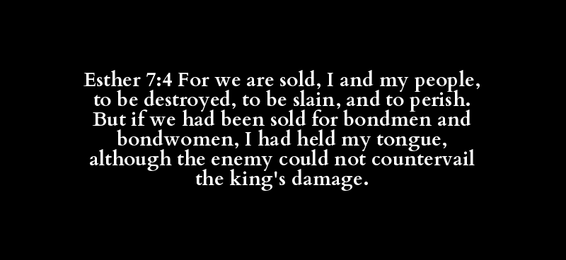 Esther 7:4 For we are sold, I and my people, to be destroyed, to be slain, and to perish. But if we had been sold for bondmen and bondwomen, I had held my tongue, although the enemy could not countervail the king's damage.