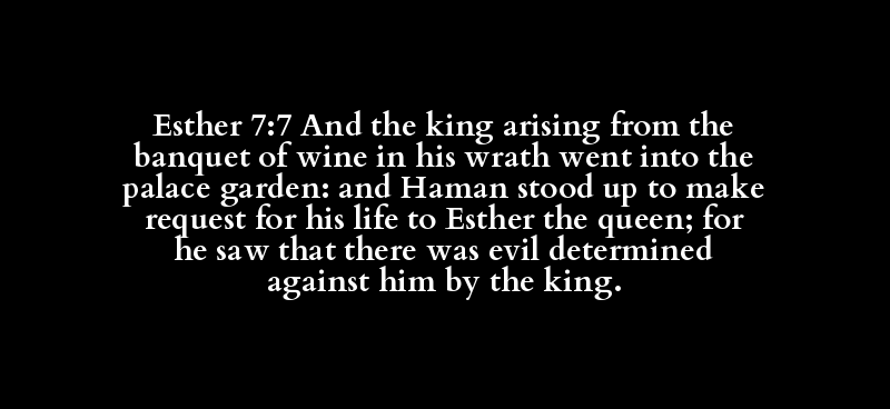 Esther 7:7 And the king arising from the banquet of wine in his wrath went into the palace garden: and Haman stood up to make request for his life to Esther the queen; for he saw that there was evil determined against him by the king.