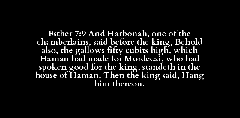 Esther 7:9 And Harbonah, one of the chamberlains, said before the king, Behold also, the gallows fifty cubits high, which Haman had made for Mordecai, who had spoken good for the king, standeth in the house of Haman. Then the king said, Hang him thereon.