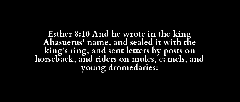 Esther 8:10 And he wrote in the king Ahasuerus' name, and sealed it with the king's ring, and sent letters by posts on horseback, and riders on mules, camels, and young dromedaries: