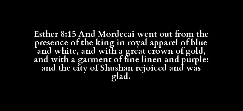 Esther 8:15 And Mordecai went out from the presence of the king in royal apparel of blue and white, and with a great crown of gold, and with a garment of fine linen and purple: and the city of Shushan rejoiced and was glad.