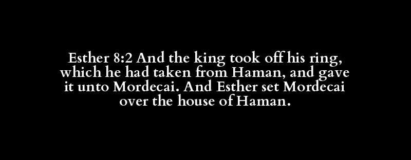 Esther 8:2 And the king took off his ring, which he had taken from Haman, and gave it unto Mordecai. And Esther set Mordecai over the house of Haman.
