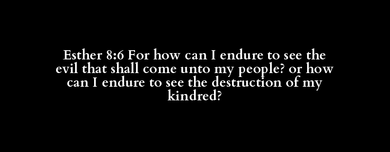 Esther 8:6 For how can I endure to see the evil that shall come unto my people? or how can I endure to see the destruction of my kindred?