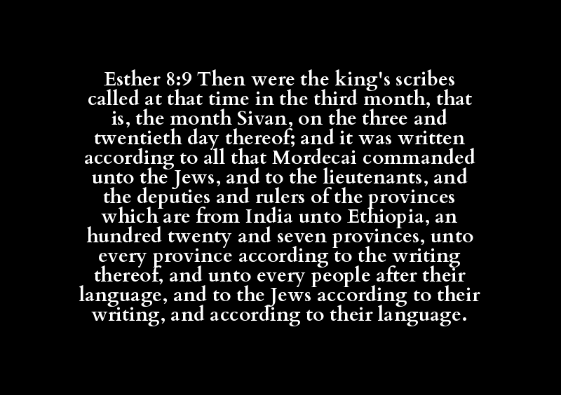 | מֶלֶךְ | סָפַר | קָרָא | עֵת | שְׁלִישִׁי | חֹדֶשׁ | חֹדֶשׁ | סִיוָן | שָׁלוֹשׁ | עֶשְׂרִים | כָּתַב | מׇרְדְּכַי | צָוָה | יְהוּדִי | אֲחַשְׁדַּרְפַּן | פֶּחָה | שַׂר | מְדִינָה | הֹדוּ | כּוּשׁ | מֵאָה | עֶשְׂרִים | שֶׁבַע | מְדִינָה | מְדִינָה | כָּתָב | עַם | לָשׁוֹן | יְהוּדִי | כָּתָב | לָשׁוֹן |
