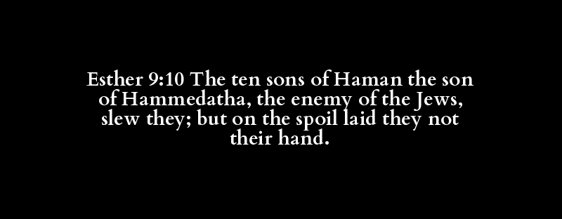 Esther 9:10 The ten sons of Haman the son of Hammedatha, the enemy of the Jews, slew they; but on the spoil laid they not their hand.