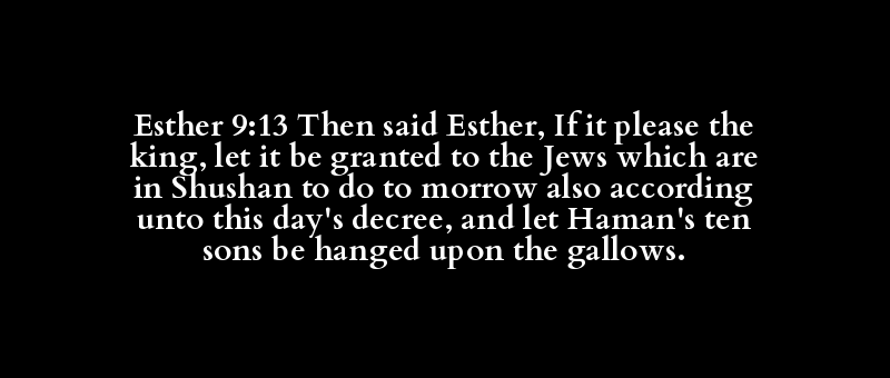 Esther 9:13 Then said Esther, If it please the king, let it be granted to the Jews which are in Shushan to do to morrow also according unto this day's decree, and let Haman's ten sons be hanged upon the gallows.