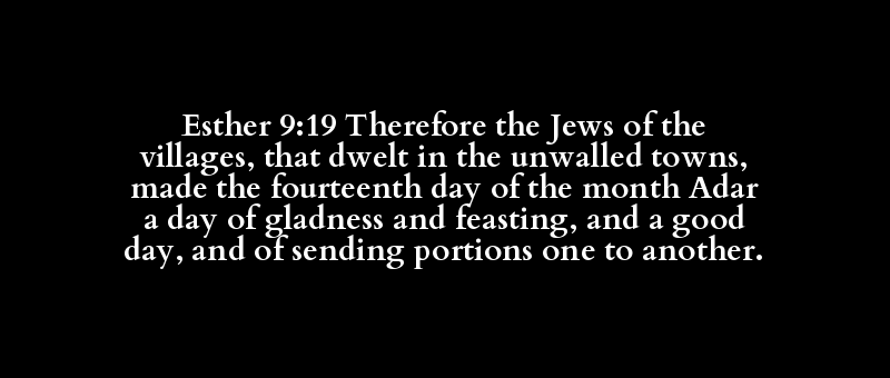 Esther 9:19 Therefore the Jews of the villages, that dwelt in the unwalled towns, made the fourteenth day of the month Adar a day of gladness and feasting, and a good day, and of sending portions one to another.