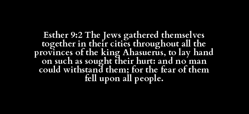 Esther 9:2 The Jews gathered themselves together in their cities throughout all the provinces of the king Ahasuerus, to lay hand on such as sought their hurt: and no man could withstand them; for the fear of them fell upon all people.